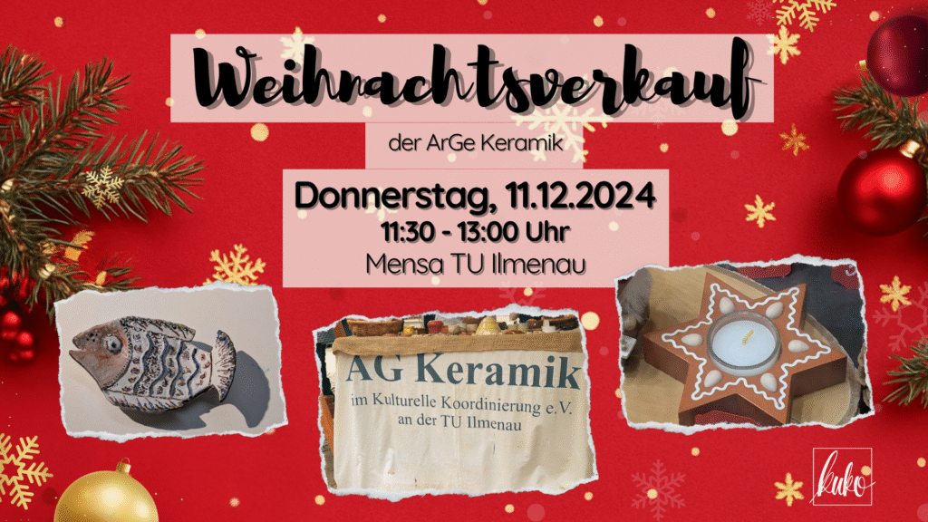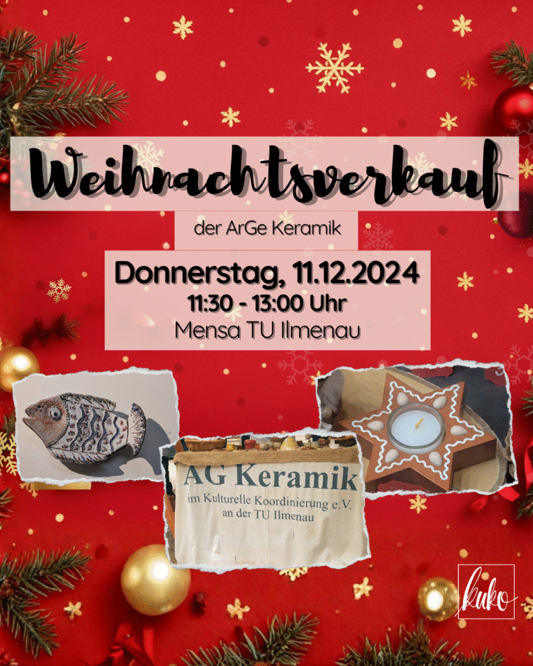 The AG Keramik im KuKo e.V. invites you to its traditional Christmas sale again this year. The small but creative workshop produces ceramic pieces all year round, which are patiently shaped, glazed and fired. Each piece is truly unique – from Christmas decorations and gift ideas to timeless everyday companions.