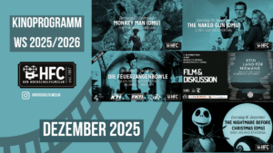 Während der Veranstaltung werden Foto – und Videoaufnahmen gemacht, die in digitalen Medien und/oder in Drucksachen des Hochschulfilmclubs veröffentlicht werden.